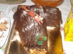 Fiz o seguinte para o recheio foi tabulete de chocolate de leite c/ amêndoas e meia tabulete de chocolate preto amargo que se usa na mousse de chocolate, foi ao lume muito baixinho e em em banho maria, coloquei lá dentro os chocolates , um pouquinho de margarina ou manteiga e um pacote de 200ml de natas ( eu sei que no brasil se dá outro nome a isto mas eu juro que não me lembro, me deu uma branca completa) deixei derretertudo muito bem e depois foi só barrar a torta. Para a cobertura a formula foi a mesma o que mudou foi o chcolate de leite foi o mesmo mas sem as amêndoas, oresto é tudo igual, no final depois de ter coberto a torta e deuixado esfriar é que meti o açúcar em pó, ou melhor foi açúcar cristal, só que moído napicadora para ficar bem fininho.