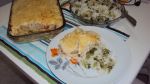 regar azeite num refratário com as batatas o tomate, fritar a cebola no azeite e só misturar o bacalhau, colocar o molho branco em cima e o queijo parmesão, levar ao forno para gratinar.