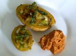 Cortar as partes duras do aspárgos. Cortar as pontas e refogar com uma gotinha de azeite, reservar para enfeitar. O resto, cortar em rodelas finas. Na mesma frigideira com pouco azeite, refogar o alho-poró, o que restou dos centros das batatas, sal, pimenta e cominho. Mexer bem e retirar do fogo. Juntar o queijo e depois de mexer tudo muito bem, rechear as batatas.