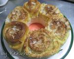 Pra fazer a rosca eh facil. Abra a massa em uma superficie lisa, coloque o recheio e enrole a massa fazendo um rocambole. Depois corte em partes. Eu dividi em 6 e deu certinho na minha forma de 21,5 cm do Brasil. Entao acomodei as 6 partes dentro da forma, uma ao lado da outra. As partes se uniram enquanto assavam pq cresceram mais com o calor do forno, e qdo terminou estavam grudadinhas.