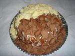 4º recheio: Mousse de chocolate: Derreta em uma lata de creme de leite 300 gr. de chocolate ao leite e 1/2 colher de gelatina incolor derretida, depois de frio, misture ao creme 2 claras batidas em neve bem firme