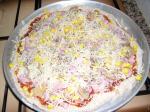 uma massa de pão fresca(compro em qualquer padaria, hipermercado) molho base para pizza queijo e fiambre fatiado milho, cogumelos e bacon em cubinhos queijo ralado